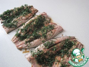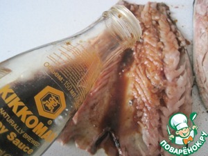 Втираем соевый соус массирующими движениями, посыпаем приправу для рыбы.