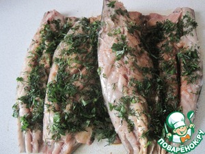 У меня было две рыбины и перед тем как свернуть рулет, посыпала их желатитом.