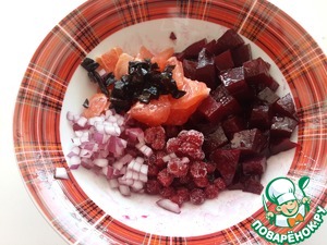 Отварную свеклу нарежьте кубиками, мелко нарубите красный лук, добавьте грейпфрут, бруснику и чернослив