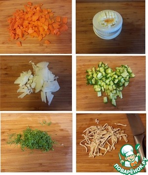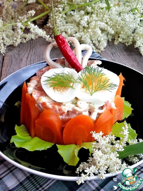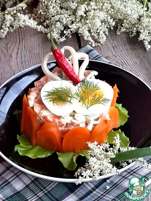 Нарезать отварную морковь, яйца, лук (ошпарить его кипятком), свежий огурец, укроп и отварные кальмары