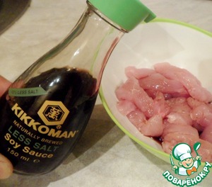 Грудку нарезать длинными, тонкими полосками, залить 1 ст. л. соевого соуса ТМ «Киккоман» и оставить мариноваться на 15 минут.