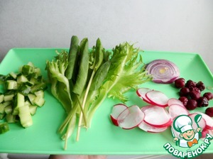 Огурцы нарезать кубиками. Салат и щавель нарвать крупными кусками, лук и редис нарезать слайсами, вишню немного разморозить.