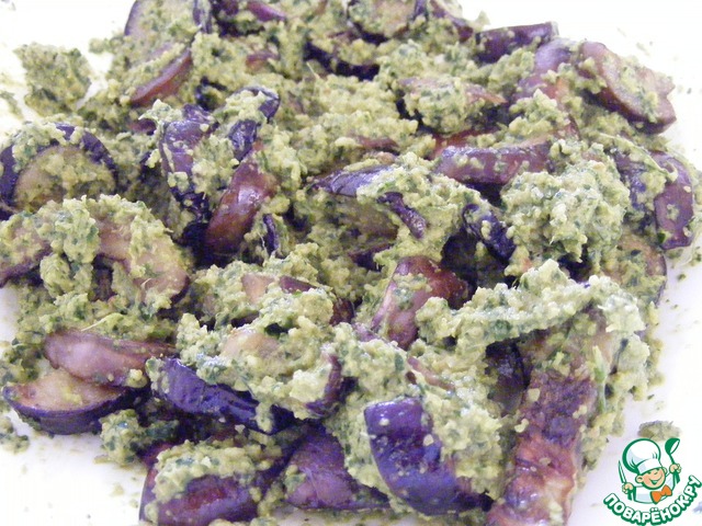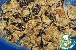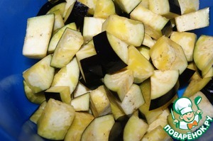 Баклажаны нарезать на кусочки, добавить масло и перемешать.