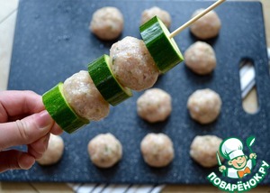 Потребуются деревянные шпажки. Нанизать на каждую шпажку по 3-4 тефтельки поочередно с кружочками цуккини; начинаем и заканчиваем "шашлычок" кружочком цуккини. Получится 4 шпажки по 4 тефтельки на каждой (16 шт.) или 5 шпажек по 3 тефтельки, как у меня (15 шт.) Зависит от размера шпажек...