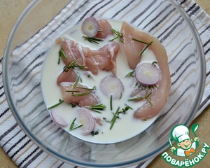Куриную грудку нарезать и "замариновать" с луком-шалот, розмарином и майораном в молоке (150 мл) на 1 час. В рецепте-оригинале куриное мясо маринуется в белом сухом вине, но я приспособила этот рецепт для "нужд" своей семьи..., поэтому замачиваю курицу в молоке!