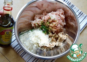 Приготовить фарш. Пропустить куриное мясо через мясорубку (или измельчить в блендере), добавить отжатый от молока хлеб, 2 ст. л. тёртого сыра пармезан, соевый соус и измельченные петрушку и розмарин. Как следует все перемешать.