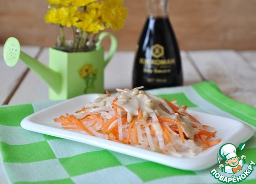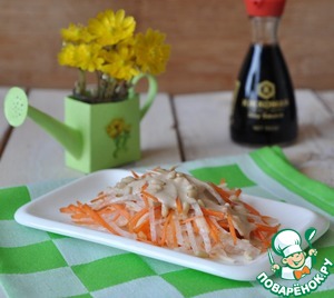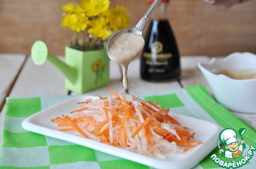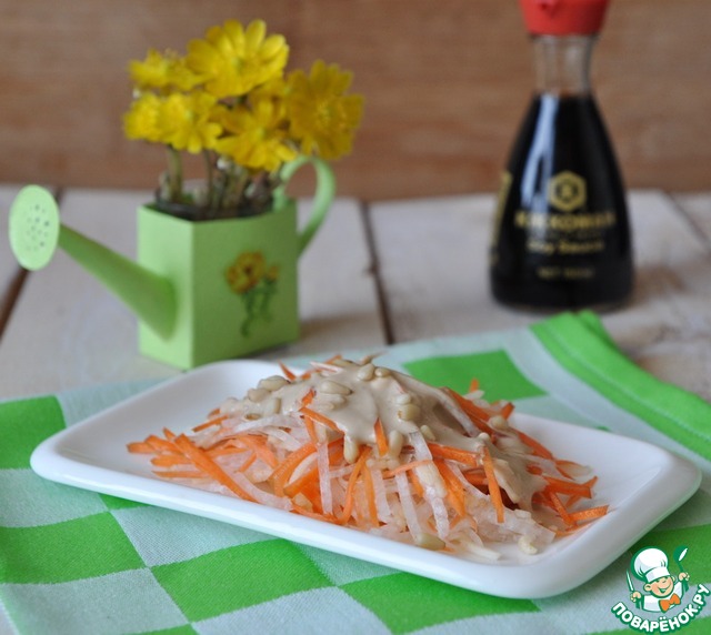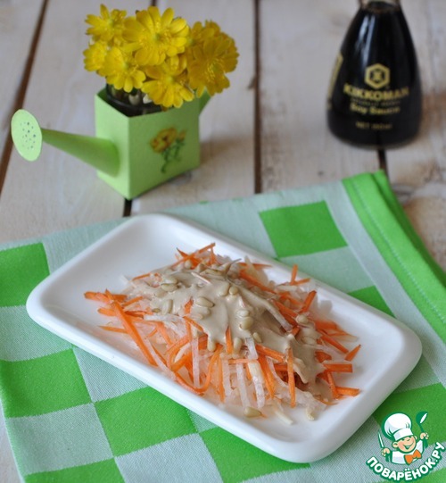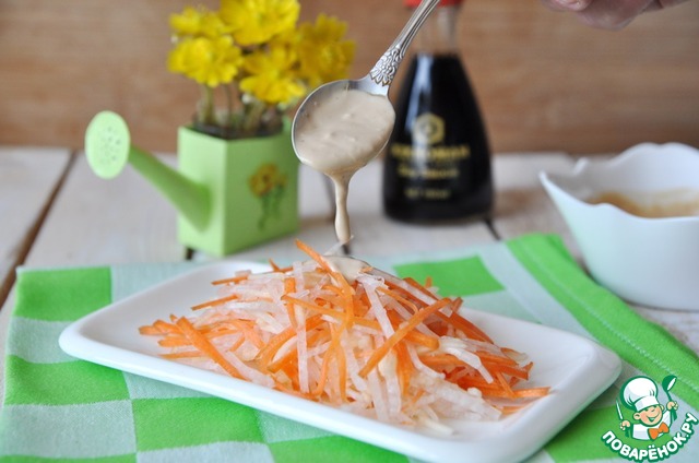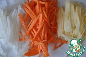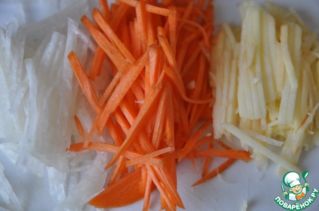 Морковь, яблоко, дайкон моем, чистим и натираем на тёрке тонкими полосками.