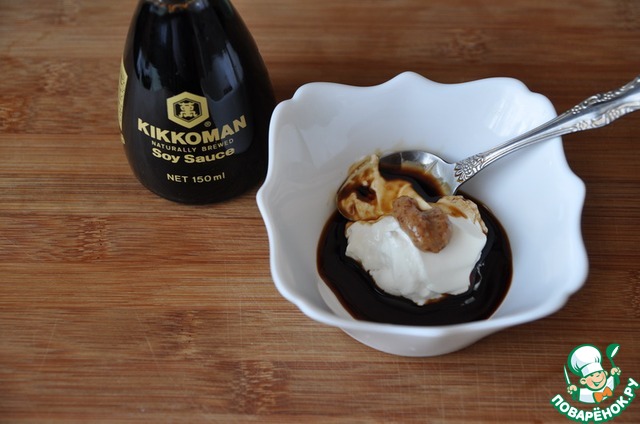 Для соуса смешиваем сметану, сладкую баварскую горчицу и соевый соус "Киккоман".