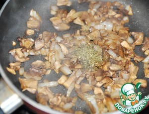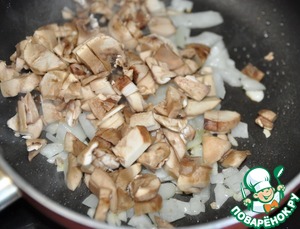 Добавляем мелкопорезанные шампиньоны или любые другие грибы. Обжариваем пару минут, помешивая.