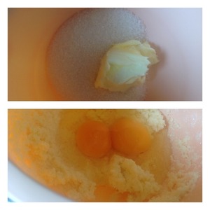 • Мягкое масло взбить до бела с сахаром. Добавить яйца. Взбить.