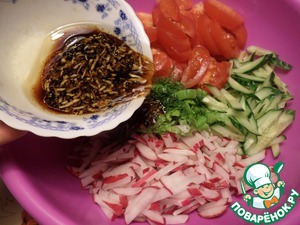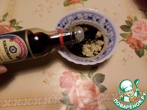 Готовим заправку для салата : смешиваем соевый соус "Kikkoman", измельченный чеснок и растительное масло.