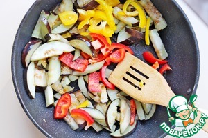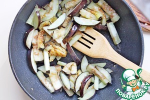 Тем же временем на сковороде на оливковом масле обжариваем на сильном огне до румяности нарезанный брусочками баклажан. -