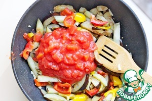 Добавить мелко нарезанный чеснок и жарим еще 1 мин, влить томаты кусочками, перемешать, приправить и тушим мин 5.