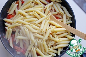 Тем временем паста готова, добавляем ее к соусу, влить примерно с пол чашки отвара в котором варилась паста, перемешать и тушить вместе еще 1 мин.