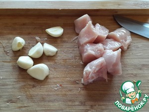 Куриное филе нарежьте на кубики примерно 3*3 см. Чеснок разберите на дольки. Если чеснок крупный, то разрежьте дольки пополам.