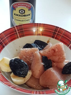 Сложите в миску куриное филе, чеснок и чернослив, приправьте перцем, чесночным порошком и соевым соусом "Киккоман". Коньяк от чернослива можно вылить сюда же, добавьте табаско, перемешайте и оставьте мариноваться на 1 час.