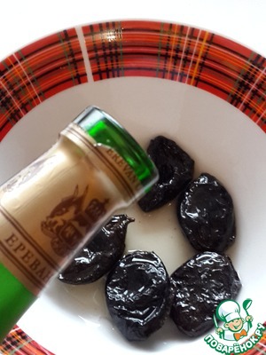 Чернослив промойте. Если он сильно сухой, залейте его на полчаса кипятком, затем обсушите на салфетке. Чернослив должен быть мягким. Обсушенный чернослив залейте коньяком на 30 минут.