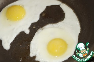 Затем поместить ломтики ветчины, а сверху выложить готовую глазунью. Можно подавать к столу. Приятного аппетита!