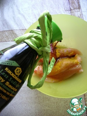 Филе разрезать на 4 части -я брала 2 внутренних филе –и полить соевым соусом и ложкой апельсинового сока, посыпать порошком карри и перемешать. Оставить мариноваться на полчаса.