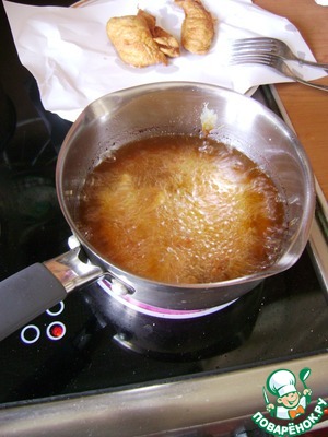 Обычно я это делаю на чуть смазанной маслом сковороде, но сегодня у меня был под рукой горячий фритюр, и я обжарила курицу там, затем обсушила на салфетке от излишков масла. Оба способа вкусны.
