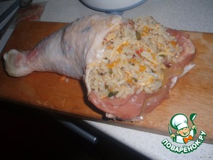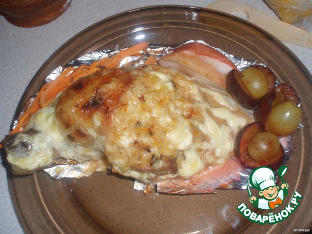 Набить (в полном смысле) ножку фаршем. Положить на фольгу, обложить яблоком, сливами с виноградом, морковью. Смазать майонезом - и в духовку, на 40 мин. Открыть фольгу и минут 5-10 под гриль. Всe. Получилось очень вкусно, особенно с фруктовым соком, который дали запеченные фрукты.