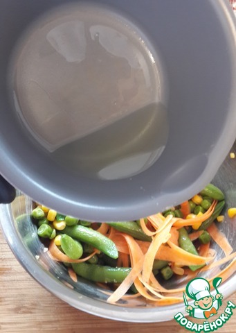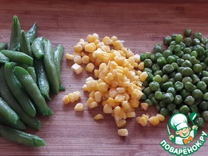 Замороженные лопаточки гороха, зеленый горошек и кукурузу по отдельности опустите в кипящую воду на 3-5 минут, затем выньте шумовкой и поместите в ледяную воду. Откиньте на сито.