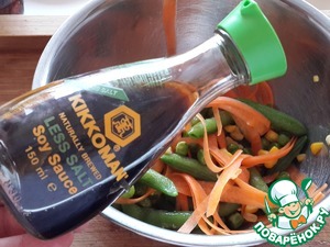 Овощи сложите в миску, приправьте сахаром, измельченным в прессе чесноком, уксусом и соевым соусом "Киккоман", при необходимости - добавьте соль по вкусу, перемешайте