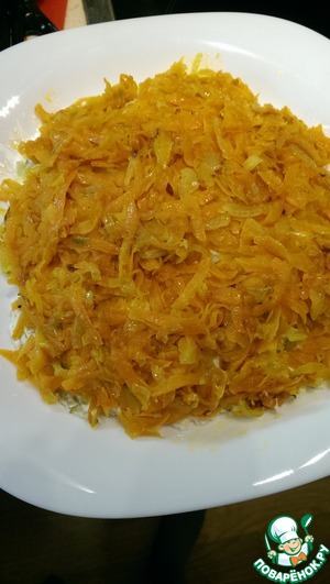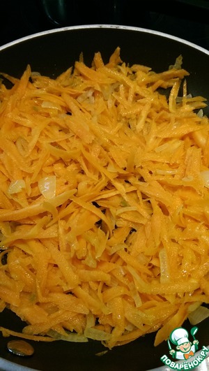 К обжаренному луку добавляем натертую на терке сырую морковь. Жарим на медленном огне до готовности, при необходимости подливаем немного воды. Солим по вкусу и оставляем остывать.