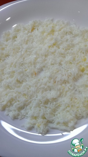 Тем временем трем на мелкой терке белки отварных яиц и выкладываем слоем на сервировочное блюдо.