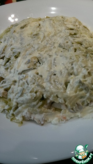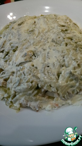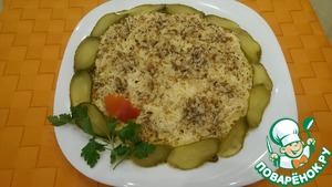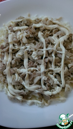 Следом натертые на крупной терке соленые огурцы, промазанные майонезом. Огурцы предварительно необходимо отжать.