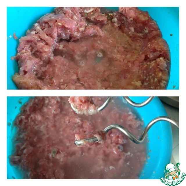 Вливаем в фарш 250 мл ледяной воды и вымешиваем фарш миксером с насадками для теста, минут 10. Добавляем еще 250 мл ледяной воды и продолжаем взбивать тесто еще минут 10.