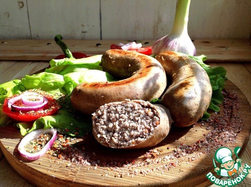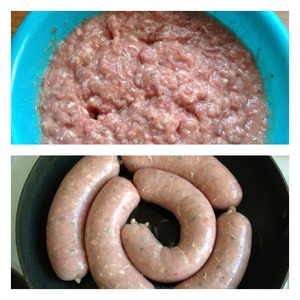 Фарш убираем на час в холодильник. Кишки моем в проточной воде. С помощью насадки на мясорубке набиваем не очень плотно кишки фаршем, и перекручиваем порционно. Иголкой сделать проколы в нескольких местах на колбасках. Если у вас нет кишки, можно фарш завернуть в пищевую пленку или фольгу. В небольшом количестве растительного масла обжариваем на сильном огне колбаски с двух сторон до золотистой корочки. Огонь убавляем и тушим колбаски еще минут 15-20.