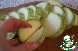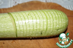 Кабачок помыть, обсушить и нарезать тонкими кружочками, НО! не разрезая до конца.