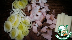 Бекон мелко порезать и обжарить с луком-пореем.