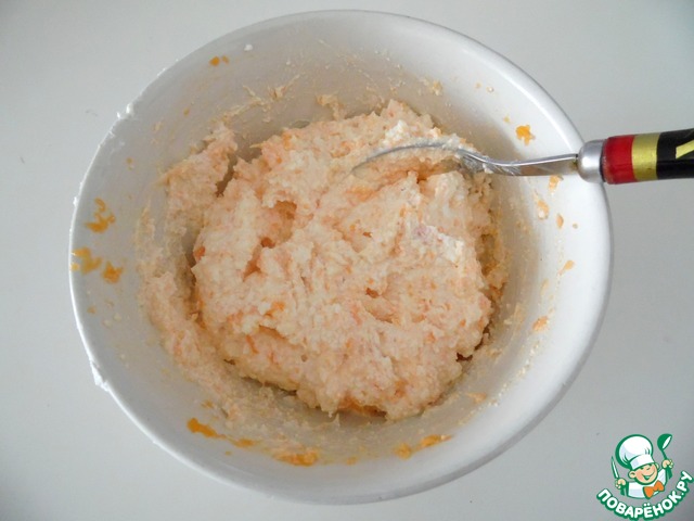 Филе рыбы добавить к смеси брынзы и тыквы. Всё очень хорошо смешать. Поставить начинку в холодильник.