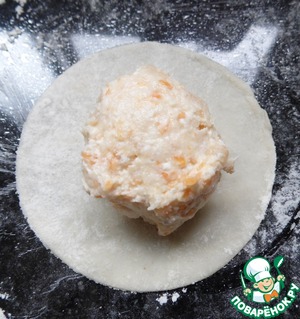 Сформировать из теста тонкие лепешки диаметром 9-10 см.: «колбаску» дм. 2см нарезать на кусочки 2см, сплющить, раскатать. Лепешки должны быть очень тонкие просвечивающиеся (у готовых изделий действительно через слой теста немного видно начинку). Я раскатывала по одной лепешке.