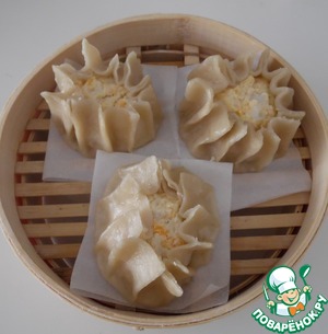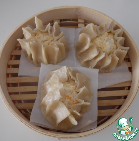 Сформировать вонтоны, лепешки в форме « открытого мешочка», края «мешочка» оставить свободными, начинка должна из него выглядывать.