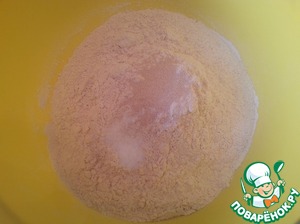 Просеять в чашу пшеничную и ржаную муку, всыпать дрожжи и соль. Всё смешать.
