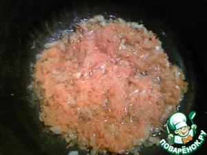 Пока жарятся котлетки, режем очень мелко лук и трем на мелкой терке морковь. Наливаем масло в казан и отправляем лук с морковью тушиться на очень медленном огне. Лук с морковью должны еле-еле жариться. Это займет примерно 30 мин