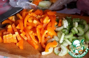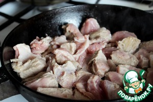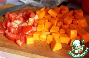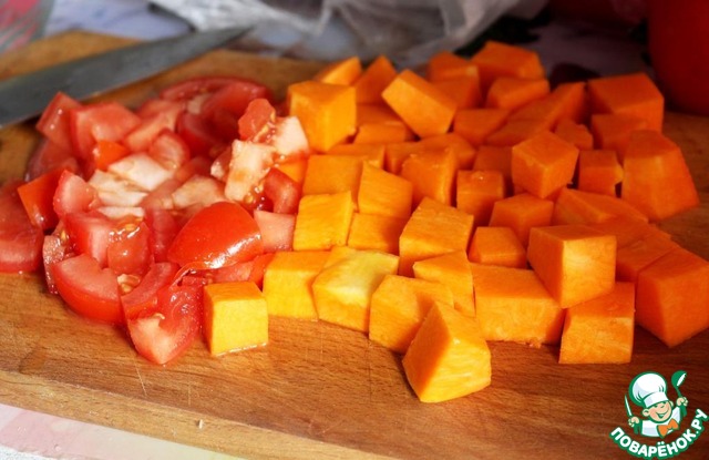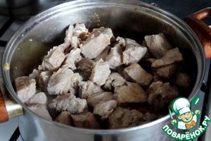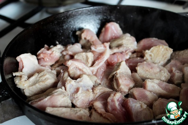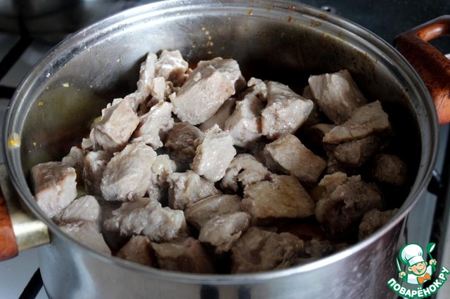 Нарежьте говядину кубиками (где-то 4х4 см) и обжаривайте на небольшом огне 15-20 минут под закрытой крышкой. А пока готовится мяско - займемся овощами.