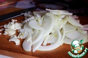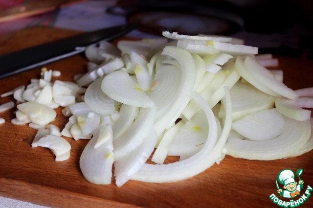Лук нарежьте полукольцами, а чеснок тонкими ломтиками.