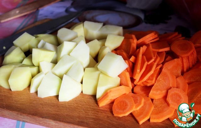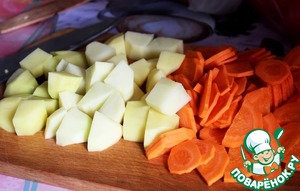 Морковь нарежьте тонкими кольцами (если крупная, то полукольцами), картофель - крупным кубиком.