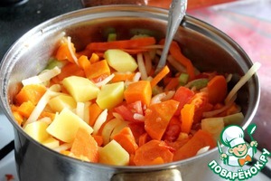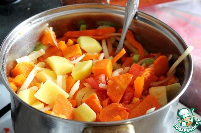 В толстостенной кастрюле разогрейте растительное масло, добавьте разом все овощи и обжаривайте 3-5 минут на большом огне. Затем уменьшите огонь до минимума, накройте кастрюлю крышкой и тушите овощи 15-20 минут, периодически помешивая (овощи дали много сока, поэтому воду я не доливала).
