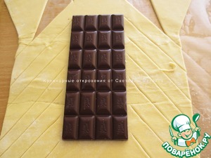 В середину положить шоколад, сделать поперечные разрезы, оставляя прямоугольную середину не тронутой