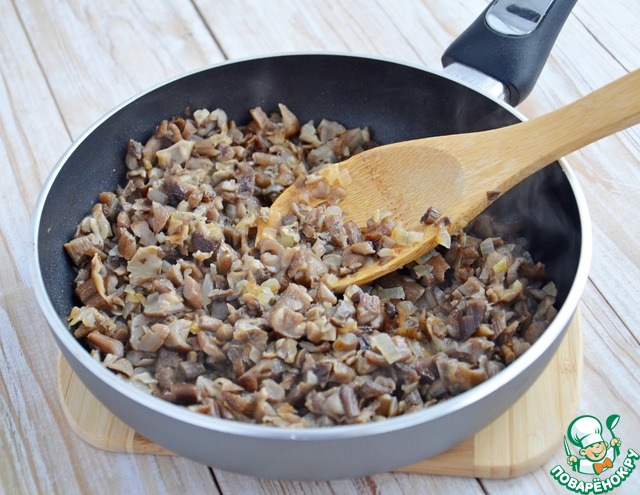Лук порубить, обжарить с рубленным чесноком и 1 ст. ложкой масла, добавить рубленные грибы, обжарить минут 5, поперчить, если нужно, то подсолить, я не солила, у меня грибы отварены в соленой воде. Грибы подойдут любые, у меня опята.