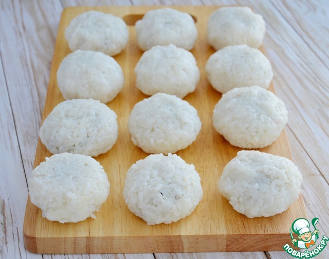 Руки смачивать водой (обязательно, иначе будет трудно формовать котлетки), набирать в ладошку рис (у меня примерно по 70-80 г риса), делать в нем углубление, в углубление класть примерно по 1 ст. ложке начинки, сформовать круглую котлетку. Вышло 12 штук.