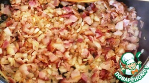 Бекон и лук нарезать кубиками. Сначала обжарить бекон, когда он подрумянится добавить лук. Запах уже сумасшедший. Чеснок раздавить плоскостью ножа, порезать и добавить к бекону с луком. Это мой самый любимый момент, чеснок раскрывает свой аромат.
