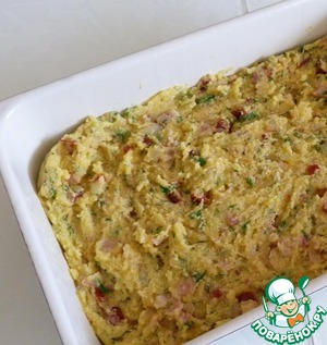 В готовую поленту добавляем все ингредиенты: бекон с луком и чесноком, томаты, зелень. Хорошенько все перемешиваем. Берем форму и смазываем ее маслом. Выкладываем нашу кашу. И ждем, когда остынет и застынет.