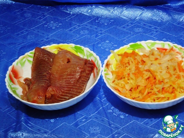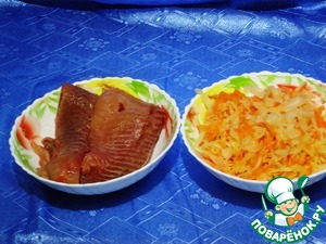 Отделяем мясо карпа от костей. Берем квашеную капусту. Хочу отметить, что мы очень любим квашеную капусту. И она в рецепте чувствуется. Поэтому надо брать такую, вкус которой Вам понравится. У меня обычная - капуста, соль и морковь.