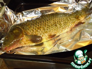 Смазываем кожу карпа приготовленной смесью. укладываем на противень на фольгу. Запекаем при 180 гр 50 - 60 минут
